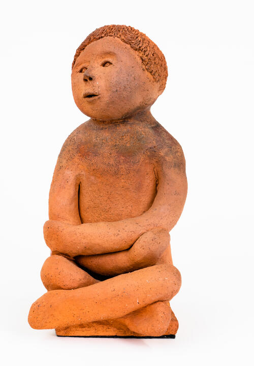 Mystery Artists' Terracotta Boy and Pepper Shaker: A sitting terracotta boy from the 1970s or 80s and a pepper shaker add an intriguing touch of mystery to the collection (creators unknown) and the second terracotta boy (the pair were bookends) appears to have run away from home.