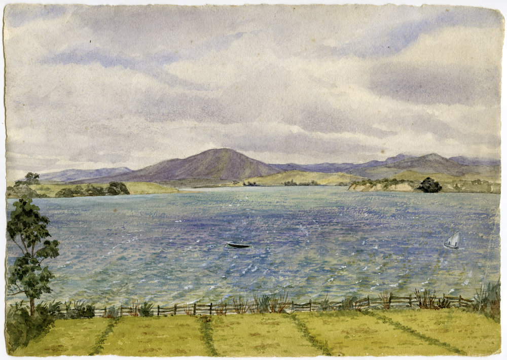 Ethel's watercolours date from a later period than Emma Vogans, around 1920 to 1949. She was born in India, raised in England, and immigrated to Katikati in her late twenties. She later moved with her husband into Tauranga and they were both very active in the community. Her husband, the Hon. Charles Edward Macmillan later became Mayor and MP for Tauranga. Their daughter Ethel Urania Macmillan donated a large sum of money to the Tauranga Art Gallery.