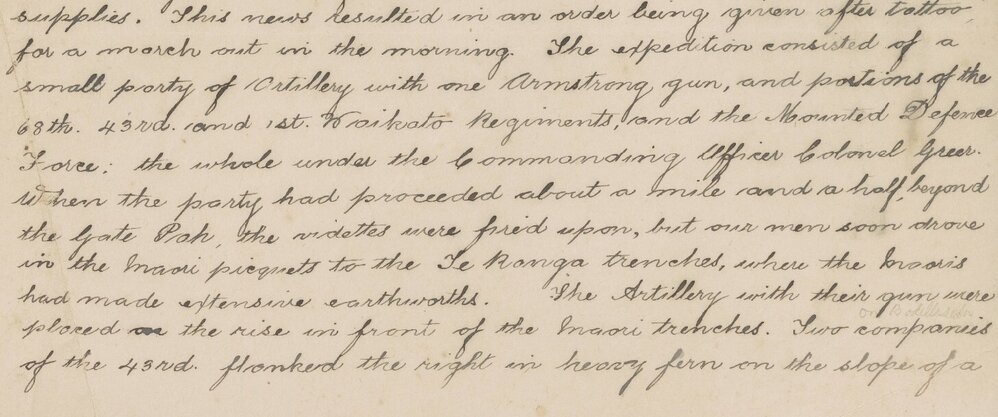 The Artillery with their gun were placed on the rise in front of the Māori trenches. Two companies of the 43rd flanked the right in heavy fern on the slope of a gully. The Mounted Defence to dismount and flanked the left until relieved by a company 68th; while the remaining portions of the 68th. and 43rd. supported our party of the 1st. Waikatos formed the attacking party. The Armstrong gun was shortly removed to flank the trenches on the left.